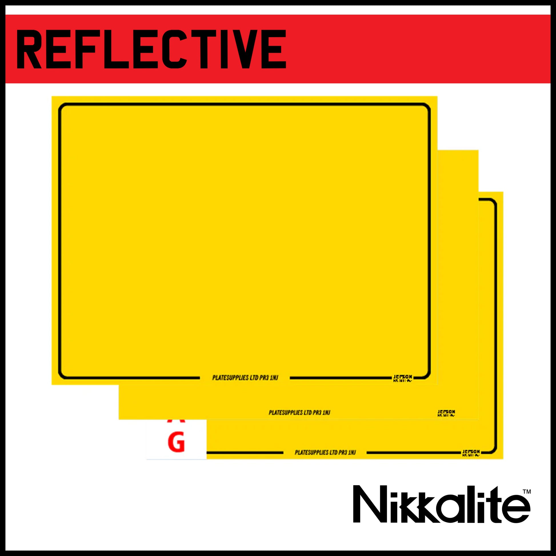 Motorcycle reflective in yellow. Available blank, with legal detail and BS tag, with a border or offset border for flag.