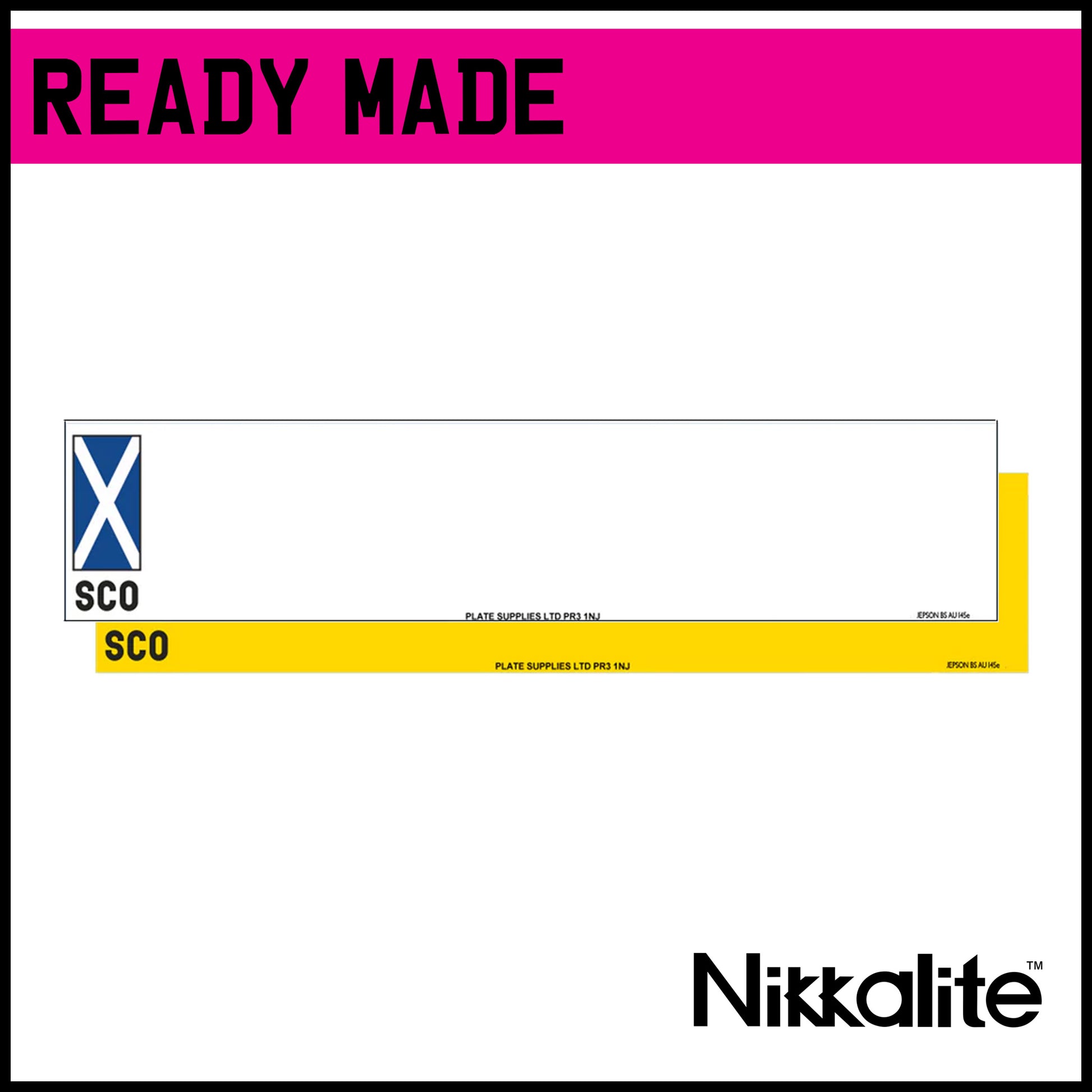 Ready made standard oblong number plates in white or yellow with the Saltire SCO identifier. Available with legal detail and BS tag, or with a border.