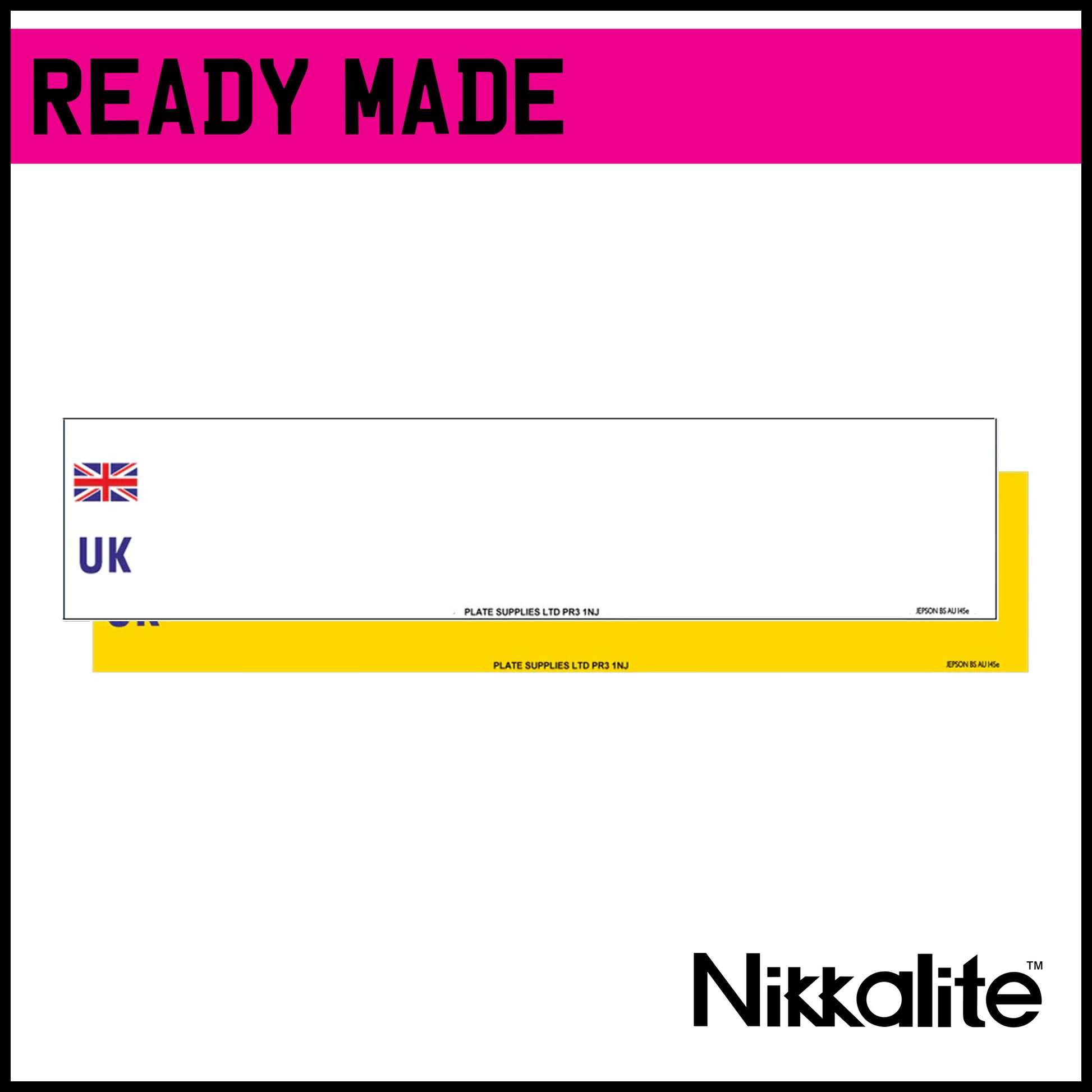 Ready made standard oblong number plate in white or yellow with the Union Jack UK identifier. Available as blank, with legal detail and BS tag, or with a border.