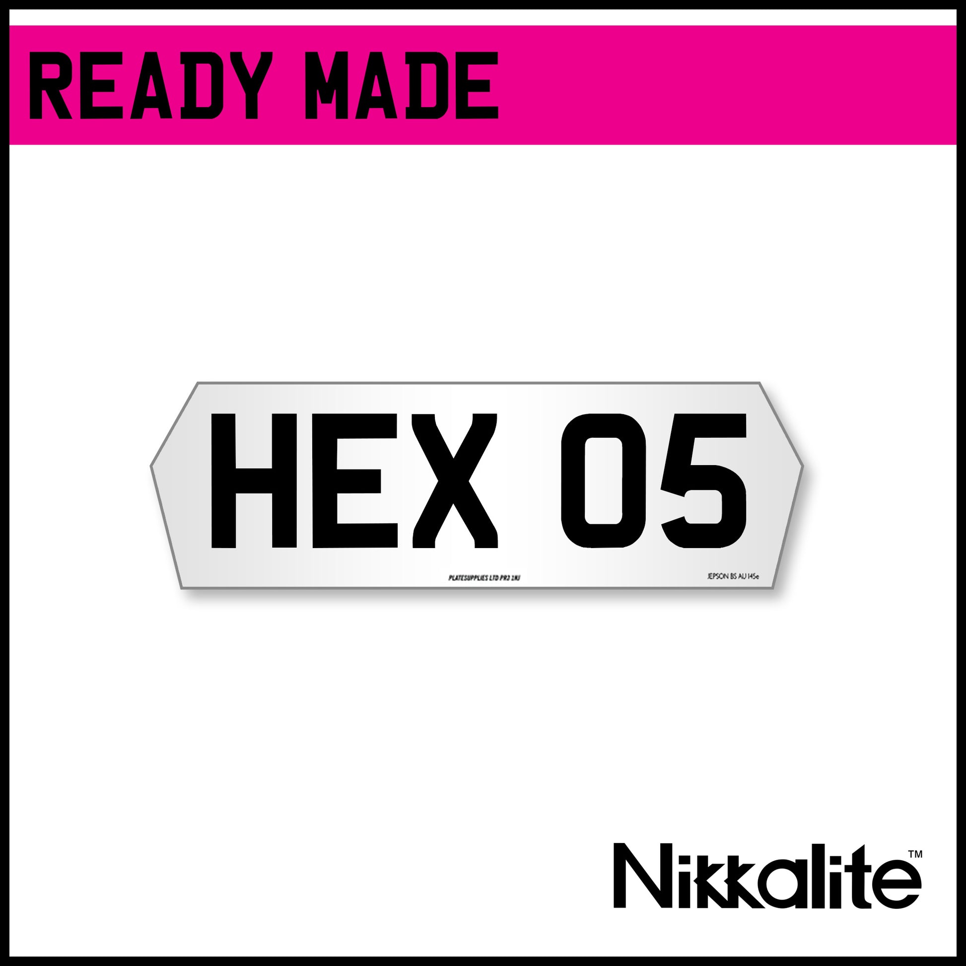 Ready made 5 digit Hex Number Plate in white. Includes BS tag details.