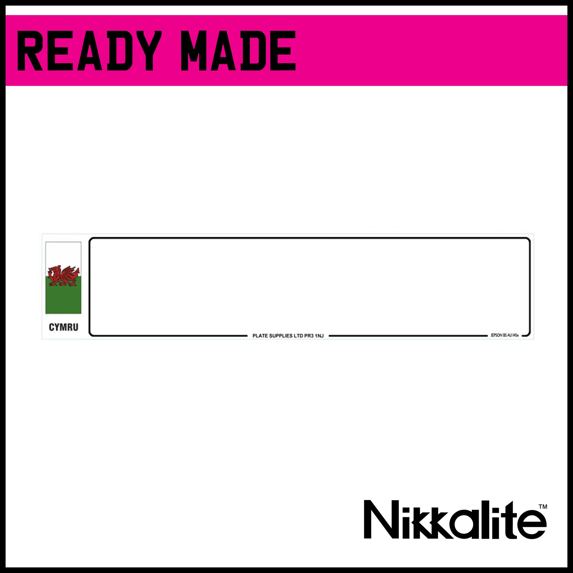 Ready made standard oblong number plate in white with the Welsh flag and CYMRU identifier. Includes BS tag details and border.