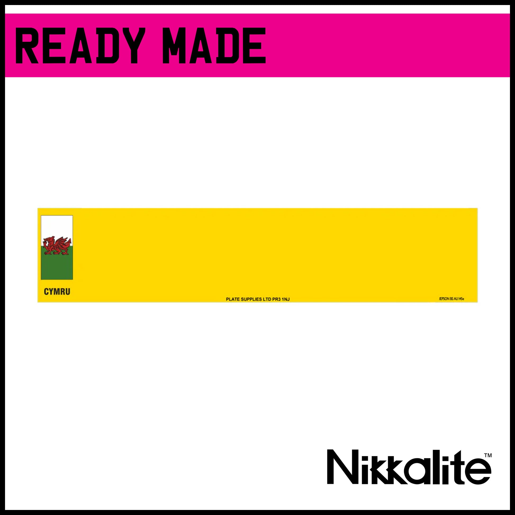 Ready made standard oblong number plate in yellow with the Welsh flag and CYMRU identifier. Includes BS tag details.