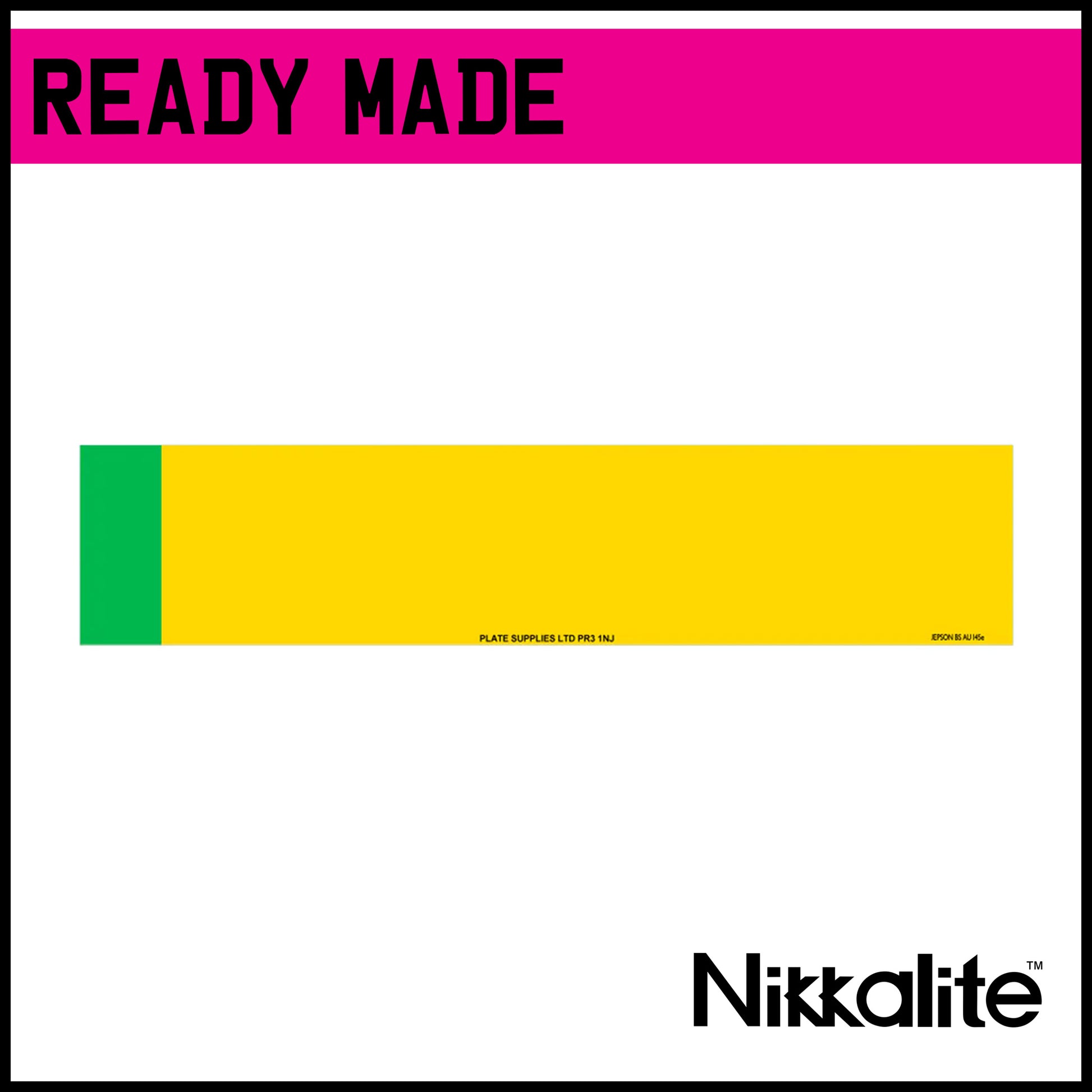 Ready made standard oblong number plate in yellow with the green electric vehicle identifier. Includes BS tag details.